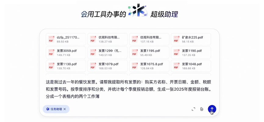 还比如,在很多员工会碰到的发票报销领域,新功能更新后,面对近百张格式不一的电子发票,千问只需拖入文件并输入指令“帮我生成年度报销台账”,千问就能自动识别关键信息,提取购买方、开票日期和金额,生成结构清晰的表格。